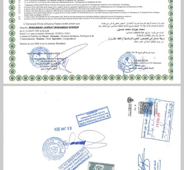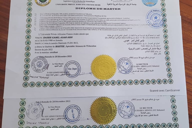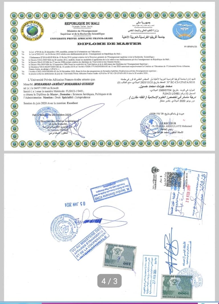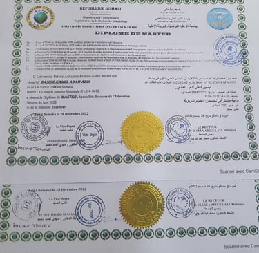 احصل على شهادة معتمدة من وزارة الخارجية بجمهورية مالي , والجامعة قانونية ومعتمدة من وزارة التعليم العالي والبحث العلمي